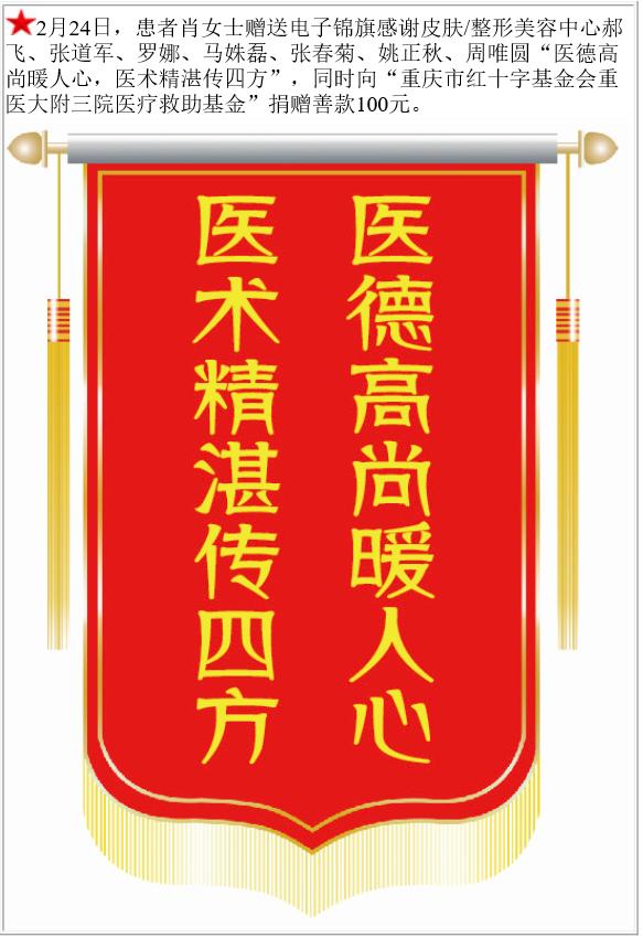 患者肖女士赠送电子锦旗感谢皮肤/整形美容中心郝飞等,并向医疗救助基金捐赠善款100元。-锦旗-患者心声-患者服务-重庆医科大学附属第三医院【官方网站】
