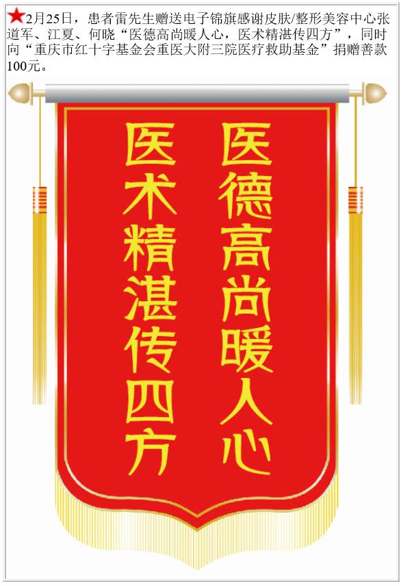 患者雷先生赠送电子锦旗感谢皮肤/整形美容中心张道军等,并向医疗救助基金捐赠善款100元。-锦旗-患者心声-患者服务-重庆医科大学附属第三医院【官方网站】