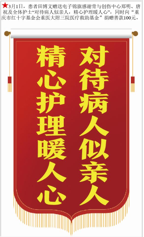 患者田博文赠送电子锦旗感谢骨与创伤中心郑明等,并向医疗救助基金捐赠善款100元。-锦旗-患者心声-患者服务-重庆医科大学附属第三医院【官方网站】
