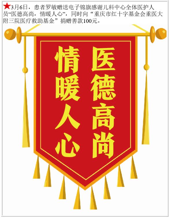 患者罗敏赠送电子锦旗感谢儿科中心全体医护人员,并向医疗救助基金捐赠善款100元。-锦旗-患者心声-患者服务-重庆医科大学附属第三医院【官方网站】