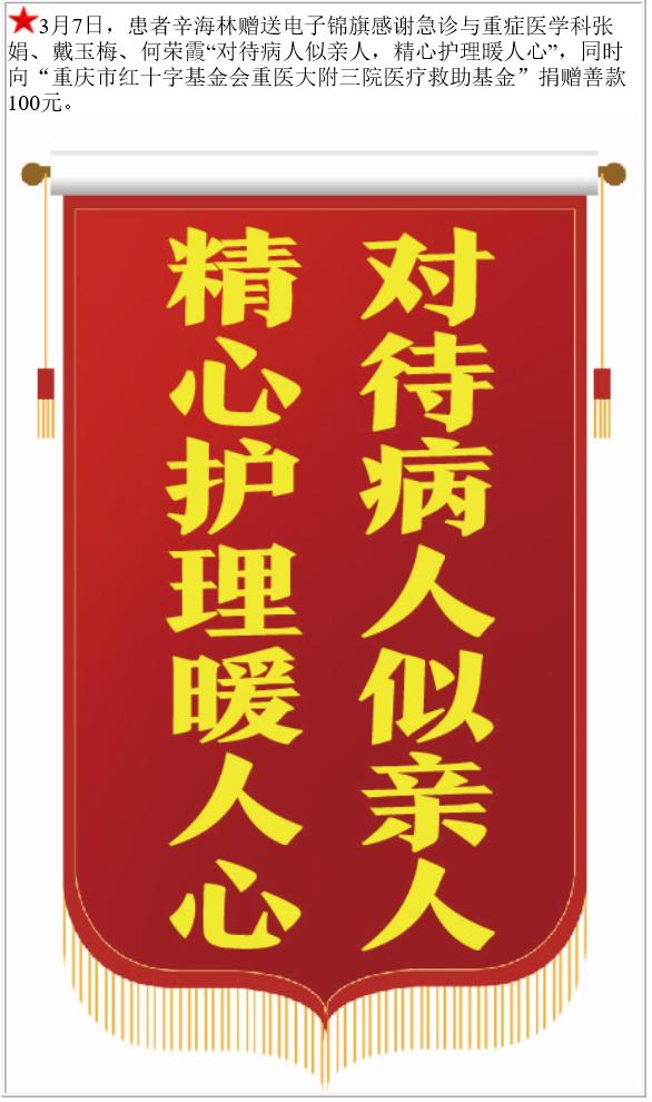 患者辛海林赠送电子锦旗感谢急诊与重症医学科张娟等,并向医疗救助基金捐赠善款100元。-锦旗-患者心声-患者服务-重庆医科大学附属第三医院【官方网站】