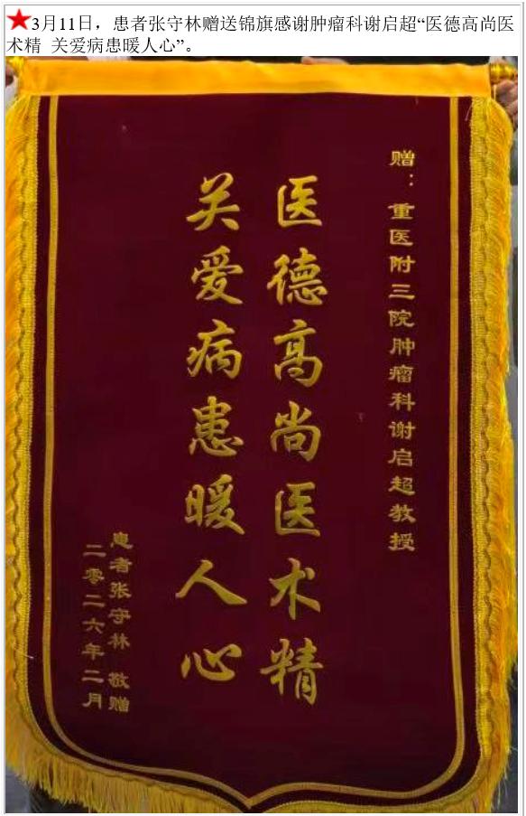 患者张守林赠送锦旗感谢肿瘤科谢启超。-锦旗-患者心声-患者服务-重庆医科大学附属第三医院【官方网站】