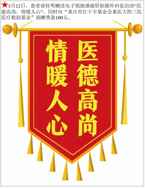 患者廖桂明赠送电子锦旗感谢肝胆胰外科张治清,并向医疗救助基金捐赠善款100元。-锦旗-患者心声-患者服务-重庆医科大学附属第三医院【官方网站】