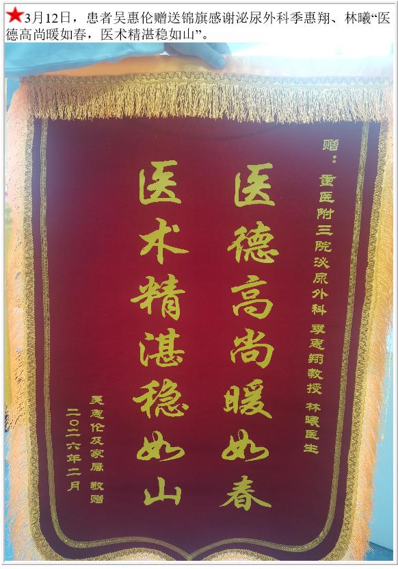 患者吴惠伦赠送锦旗感谢泌尿外科季惠翔等。-锦旗-患者心声-患者服务-重庆医科大学附属第三医院【官方网站】