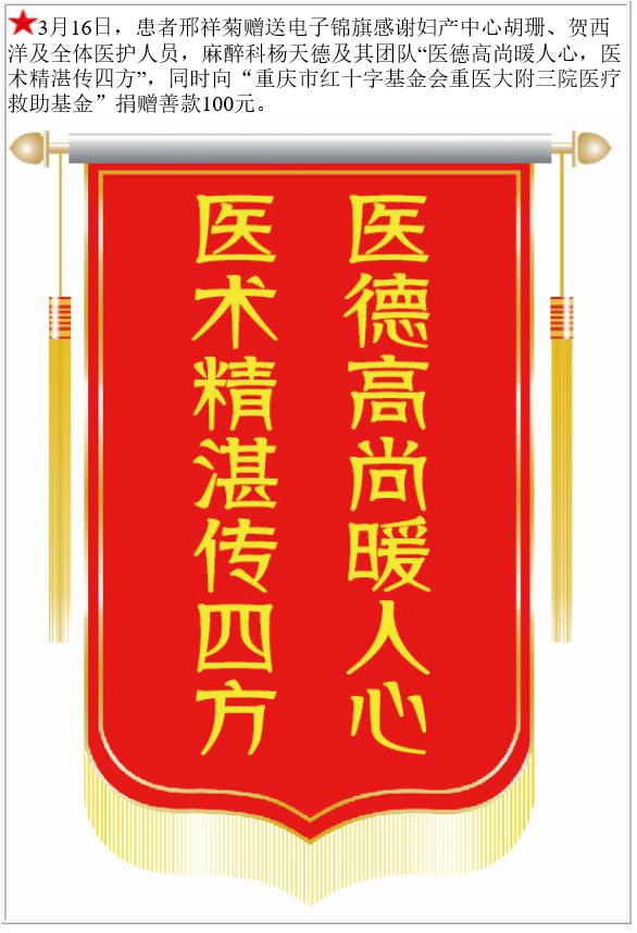 患者邢祥菊赠送电子锦旗感谢妇产中心胡珊及麻醉科杨天德等,并向医疗救助基金捐赠善款100元。-锦旗-患者心声-患者服务-重庆医科大学附属第三医院【官方网站】