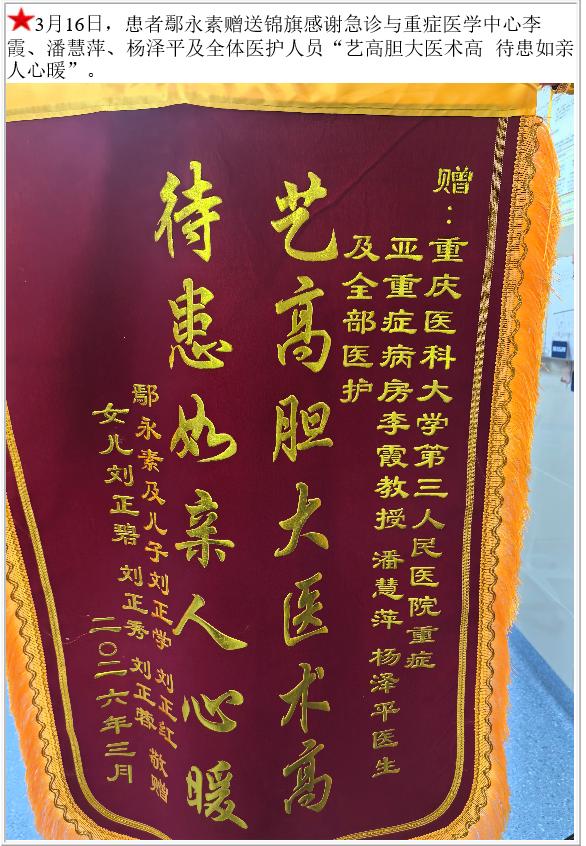 患者鄢永素赠送锦旗感谢急诊与重症医学中心李霞等。-锦旗-患者心声-患者服务-重庆医科大学附属第三医院【官方网站】