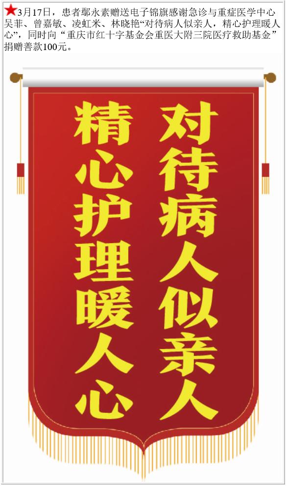 患者鄢永素赠送电子锦旗感谢急诊与重症医学中心吴菲等,并向医疗救助基金捐赠善款100元。-锦旗-患者心声-患者服务-重庆医科大学附属第三医院【官方网站】
