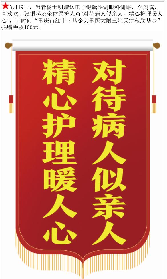 患者杨世明赠送电子锦旗感谢眼科谢琳等,并向医疗救助基金捐赠善款100元。-锦旗-患者心声-患者服务-重庆医科大学附属第三医院【官方网站】