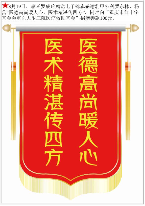 患者罗成玲赠送电子锦旗感谢乳甲外科罗东林等,并向医疗救助基金捐赠善款100元。-锦旗-患者心声-患者服务-重庆医科大学附属第三医院【官方网站】