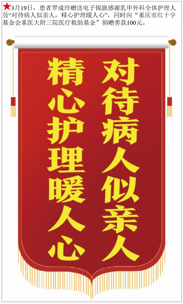 患者罗成玲赠送电子锦旗感谢乳甲外科全体护理人员,并向医疗救助基金捐赠善款100元。-锦旗-患者心声-患者服务-重庆医科大学附属第三医院【官方网站】