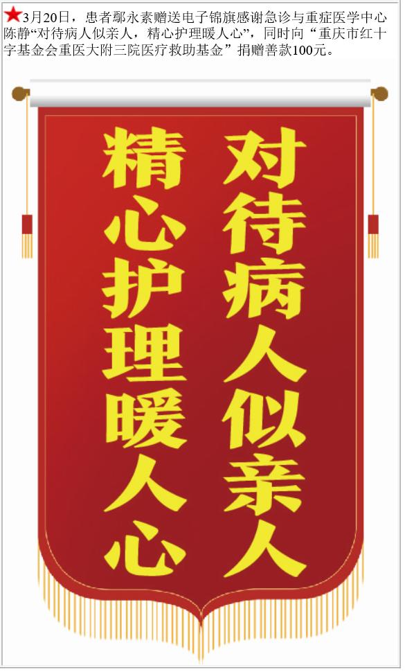 患者鄢永素赠送电子锦旗感谢急诊与重症医学中心陈静,并向医疗救助基金捐赠善款100元。-锦旗-患者心声-患者服务-重庆医科大学附属第三医院【官方网站】