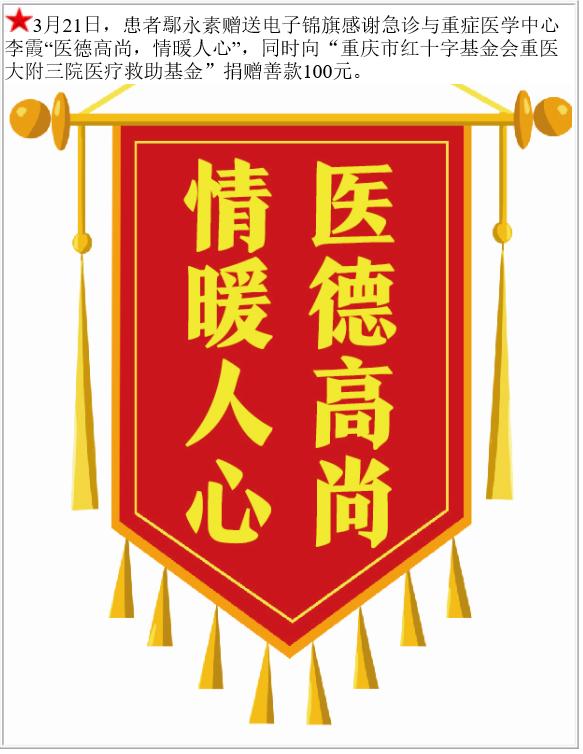 患者鄢永素赠送电子锦旗感谢急诊与重症医学中心李霞,并向医疗救助基金捐赠善款100元。-锦旗-患者心声-患者服务-重庆医科大学附属第三医院【官方网站】