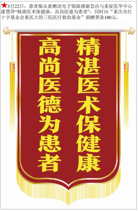 患者鄢永素赠送电子锦旗感谢急诊与重症医学中心潘慧萍,并向医疗救助基金捐赠善款100元。-锦旗-患者心声-患者服务-重庆医科大学附属第三医院【官方网站】