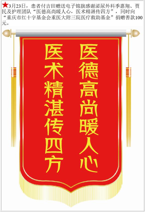 患者付吉田赠送电子锦旗感谢泌尿外科季惠翔等,并向医疗救助基金捐赠善款100元。-锦旗-患者心声-患者服务-重庆医科大学附属第三医院【官方网站】