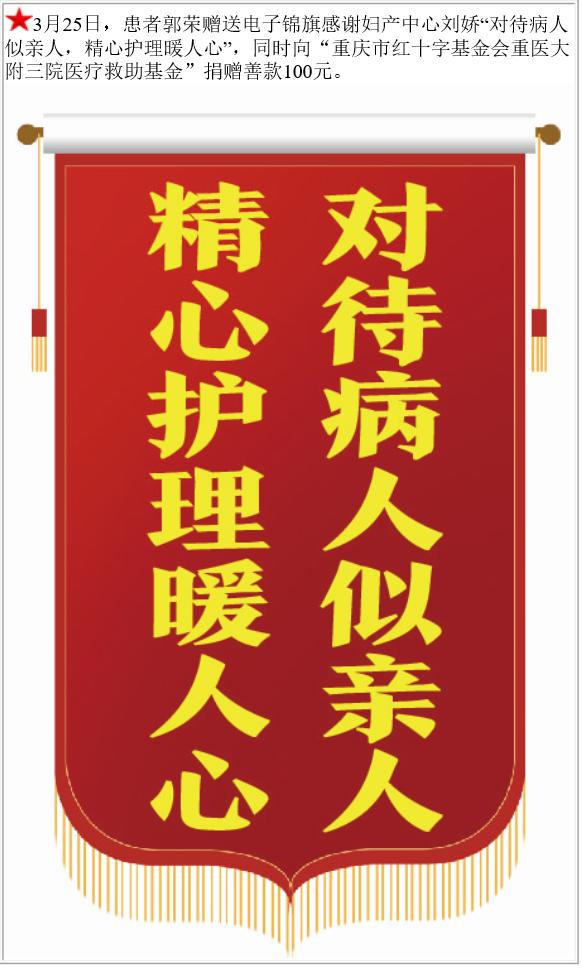患者郭荣赠送电子锦旗感谢妇产中心刘娇,并向医疗救助基金捐赠善款100元。-锦旗-患者心声-患者服务-重庆医科大学附属第三医院【官方网站】