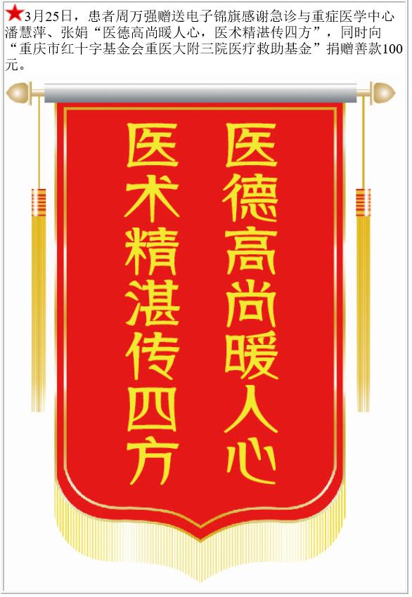 患者周万强赠送电子锦旗感谢急诊与重症医学中心潘慧萍等,并向医疗救助基金捐赠善款100元。-锦旗-患者心声-患者服务-重庆医科大学附属第三医院【官方网站】