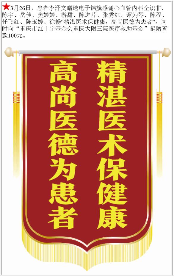 患者李泽文赠送电子锦旗感谢心血管内科仝识非等,并向医疗救助基金捐赠善款100元。-锦旗-患者心声-患者服务-重庆医科大学附属第三医院【官方网站】