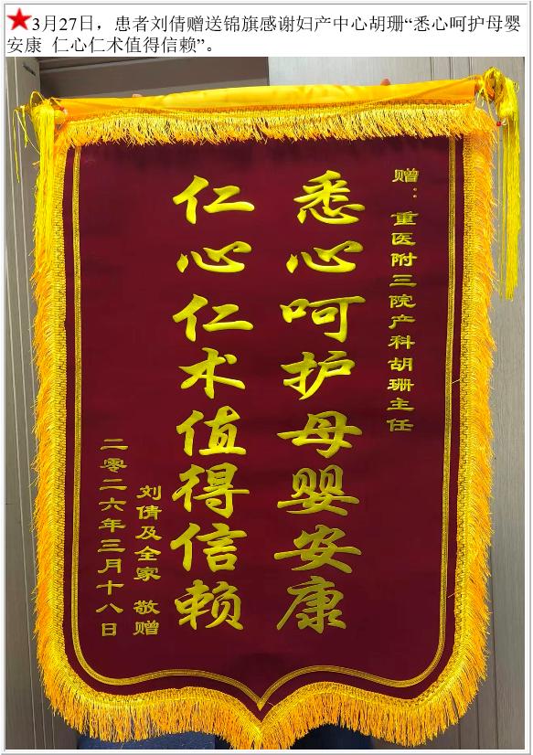患者刘倩赠送锦旗感谢妇产中心胡珊。-锦旗-患者心声-患者服务-重庆医科大学附属第三医院【官方网站】