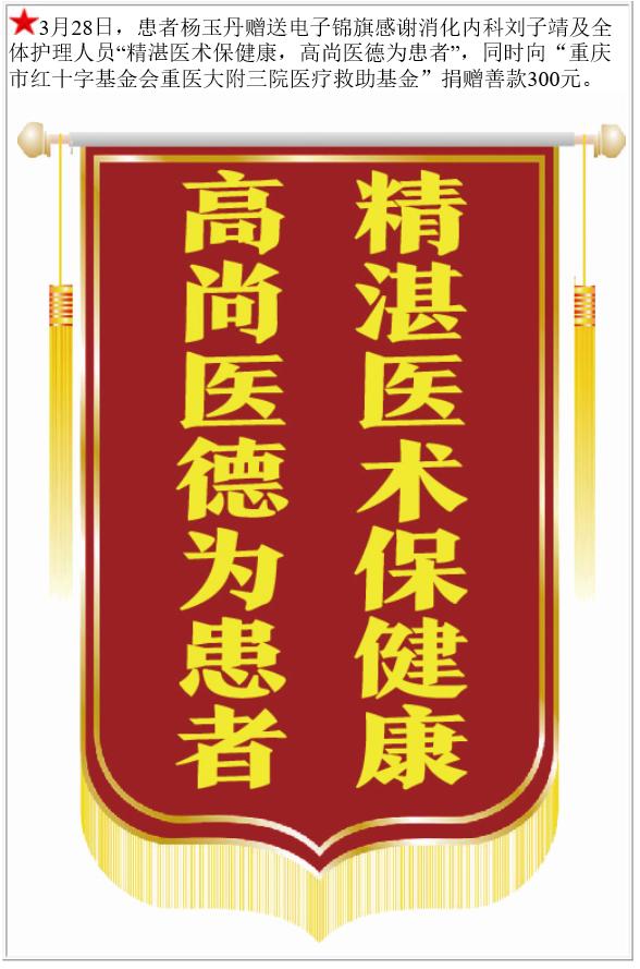 患者杨玉丹赠送电子锦旗感谢消化内科刘子靖等,并向医疗救助基金捐赠善款300元。-锦旗-患者心声-患者服务-重庆医科大学附属第三医院【官方网站】