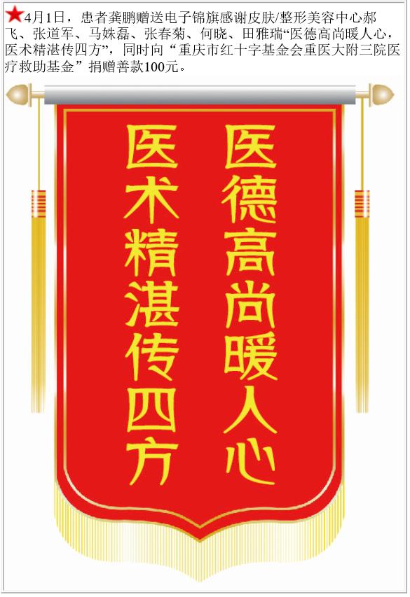 患者龚鹏赠送电子锦旗感谢皮肤/整形美容中心郝飞等,并向医疗救助基金捐赠善款100元。-锦旗-患者心声-患者服务-重庆医科大学附属第三医院【官方网站】