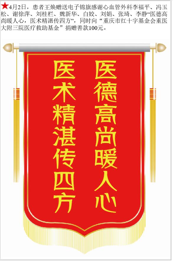 患者王焕赠送电子锦旗感谢心血管外科李福平等,并向医疗救助基金捐赠善款100元。-锦旗-患者心声-患者服务-重庆医科大学附属第三医院【官方网站】