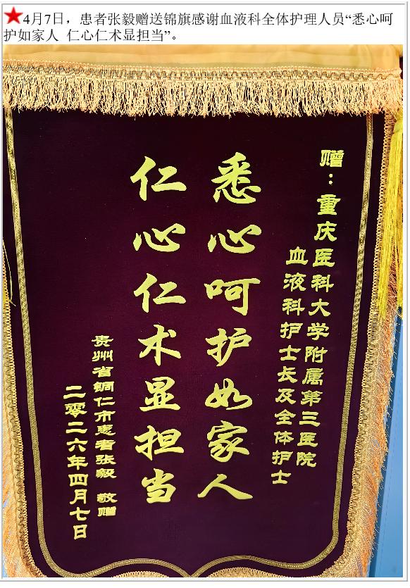 患者张毅赠送锦旗感谢血液科全体护理人员。-锦旗-患者心声-患者服务-重庆医科大学附属第三医院【官方网站】