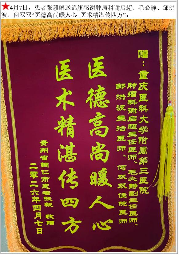 患者张毅赠送锦旗感谢肿瘤科谢启超等。-锦旗-患者心声-患者服务-重庆医科大学附属第三医院【官方网站】
