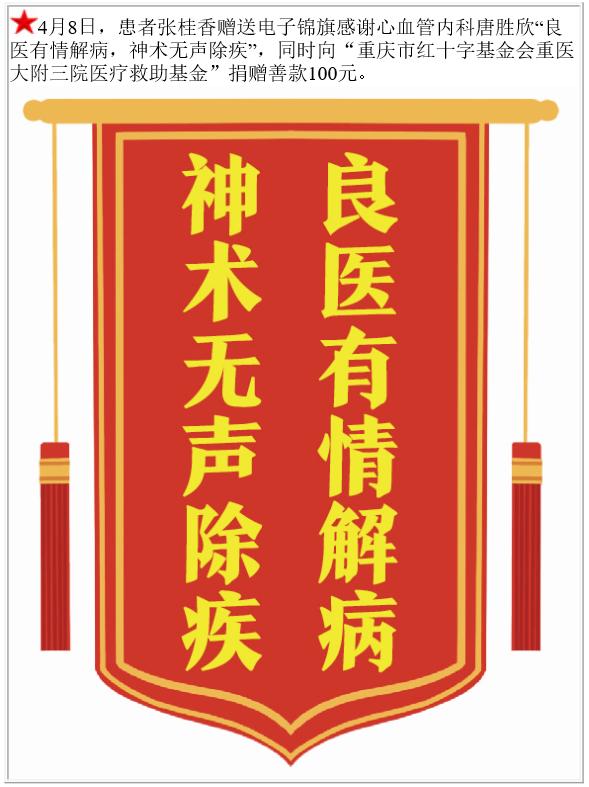 患者张桂香赠送电子锦旗感谢心血管内科唐胜欣,并向医疗救助基金捐赠善款100元。-锦旗-患者心声-患者服务-重庆医科大学附属第三医院【官方网站】