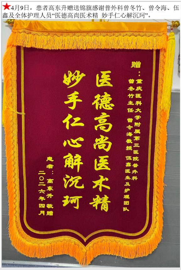 患者高东升赠送锦旗感谢普外科曾冬竹等。-锦旗-患者心声-患者服务-重庆医科大学附属第三医院【官方网站】