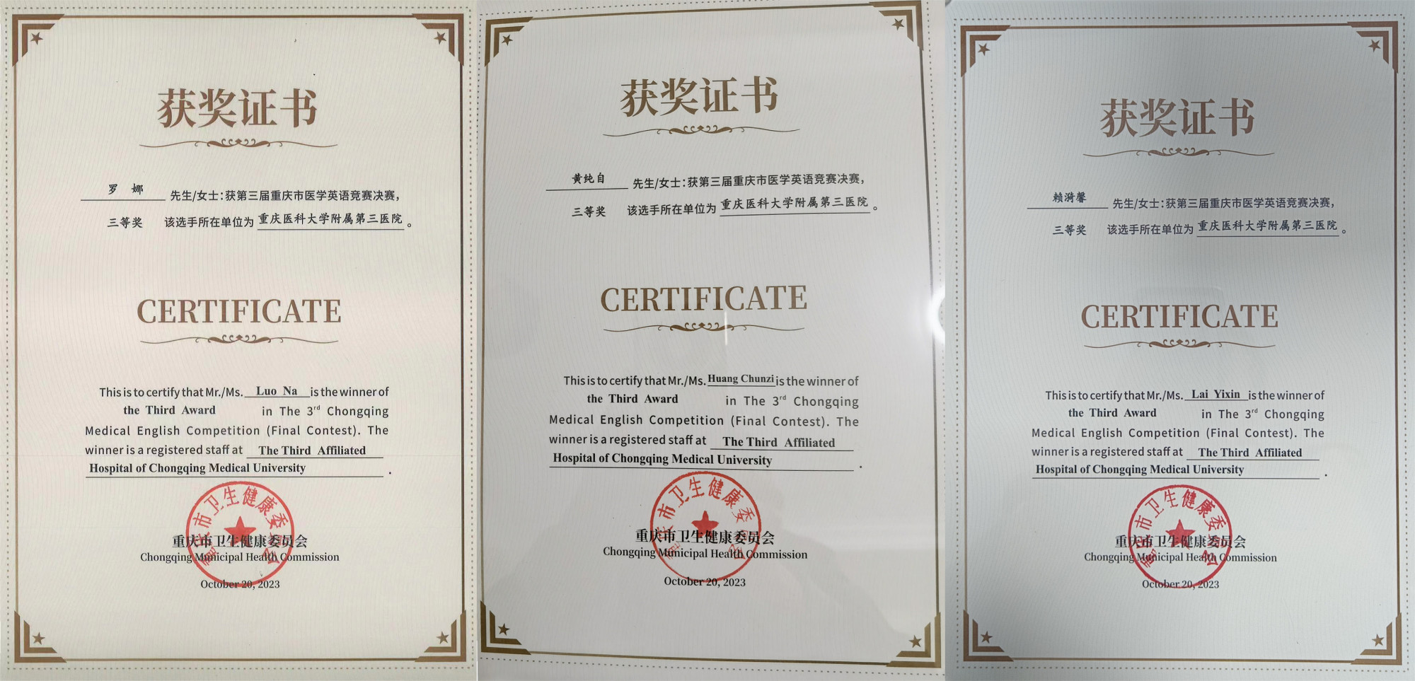 2023年10月,重医大附三院荣获“第三届重庆市医学英语竞赛决赛”三等奖