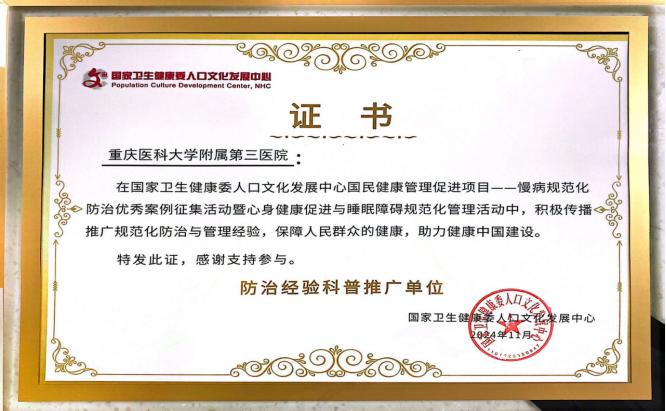 2024年11月24日,重医大附三院入选国家卫健委人口文化发展中心颁发“防治经验科普推广单位”