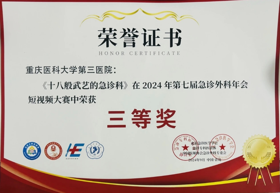 2024年9月,重医大附三院急诊与重症医学中心参赛作品荣获第七届急诊外科医师年会急诊外科短视频比赛三等奖