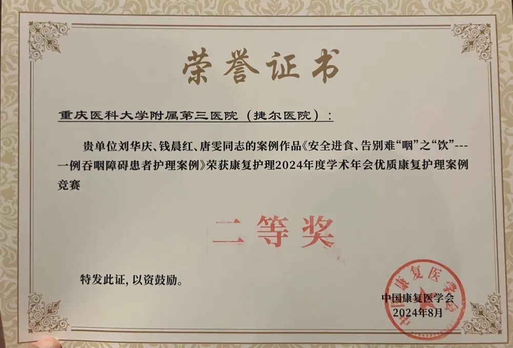 2024年9月,重医大附三院康复医学科荣获2024中国康复医学会康复护理专业委员会学术年会“优质康复护理案例全国决赛”二等奖