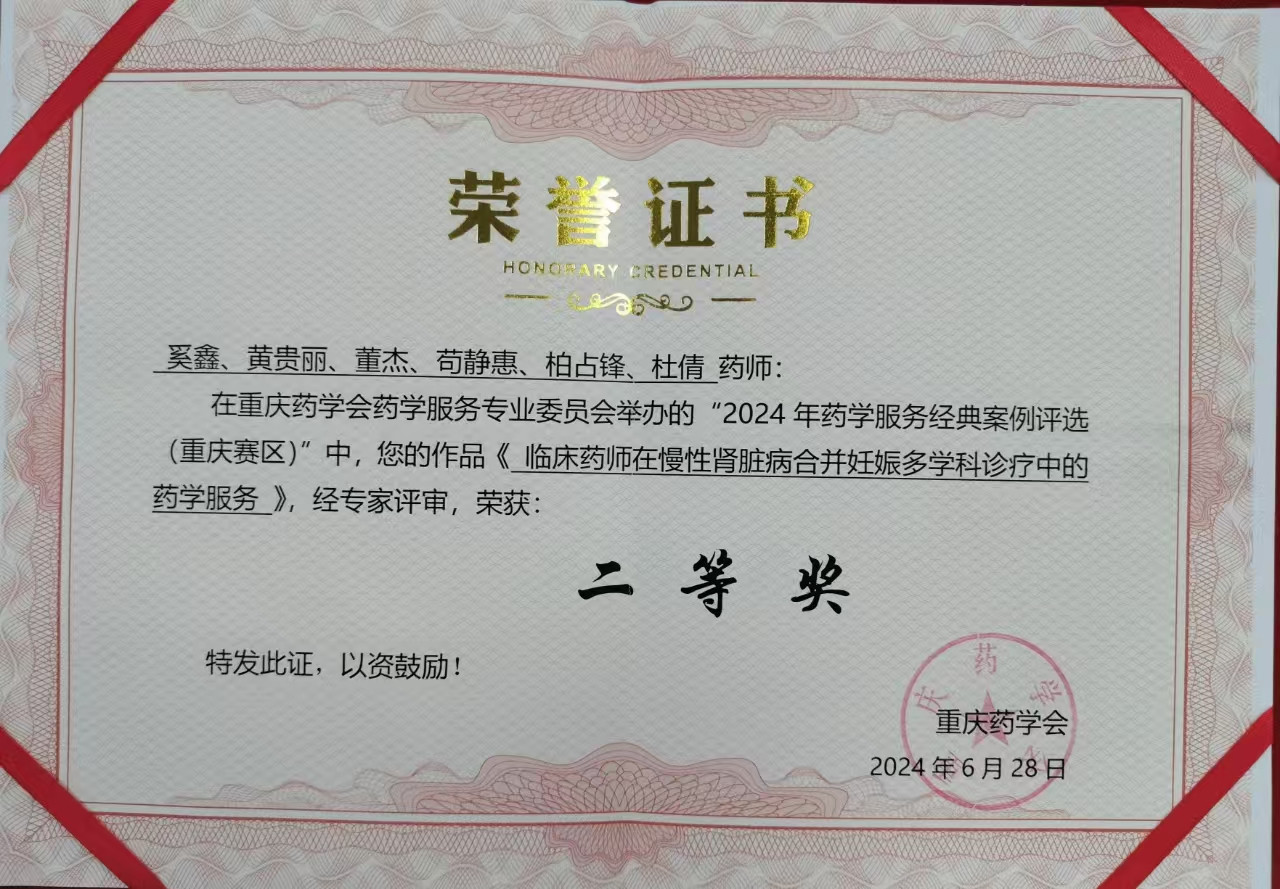 2024年6月29日,重医大附三院药剂科荣获重庆市药学会药学服务经典案例二等奖