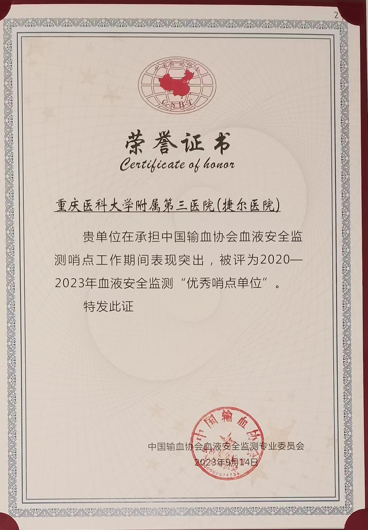 2023年9月,重医大附三院在全国血液安全监测评选中荣获“全国优秀哨点单位”