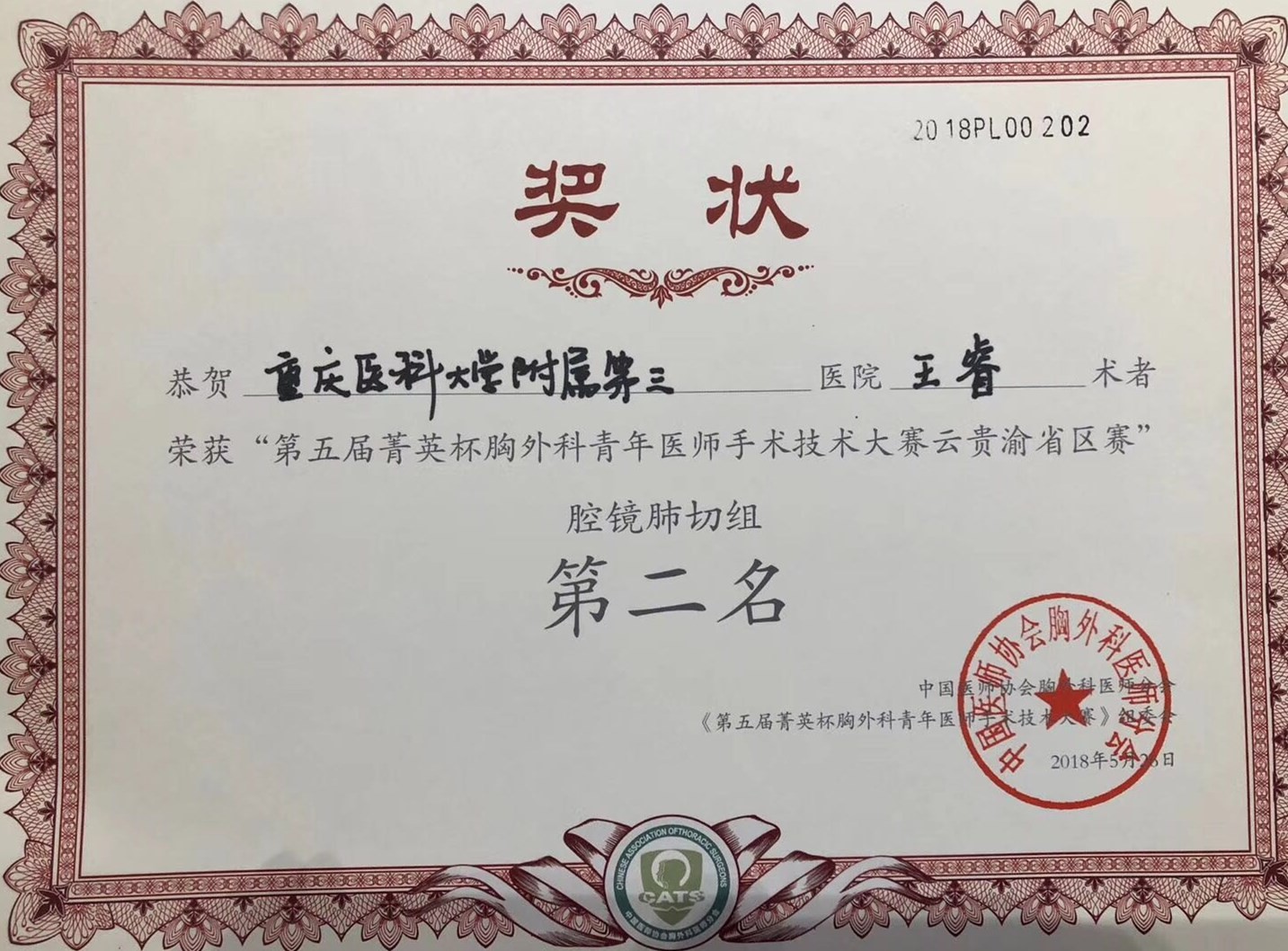 呼吸疾病中心王睿在中国医师协会胸外科医师分会举办的第五届菁英杯胸外科青年医师手术技术大赛云贵渝省区赛中荣获腔镜肺切组第二名