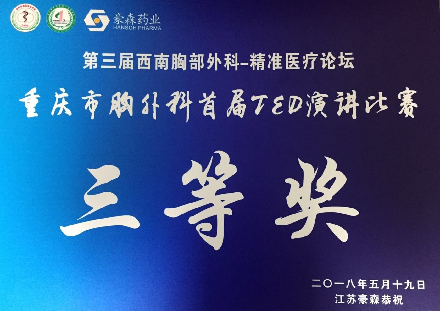 呼吸疾病中心但小双在第三届西南胸部外科精准医疗论坛举办的重庆市胸外科首届TED演讲比赛中荣获三等奖