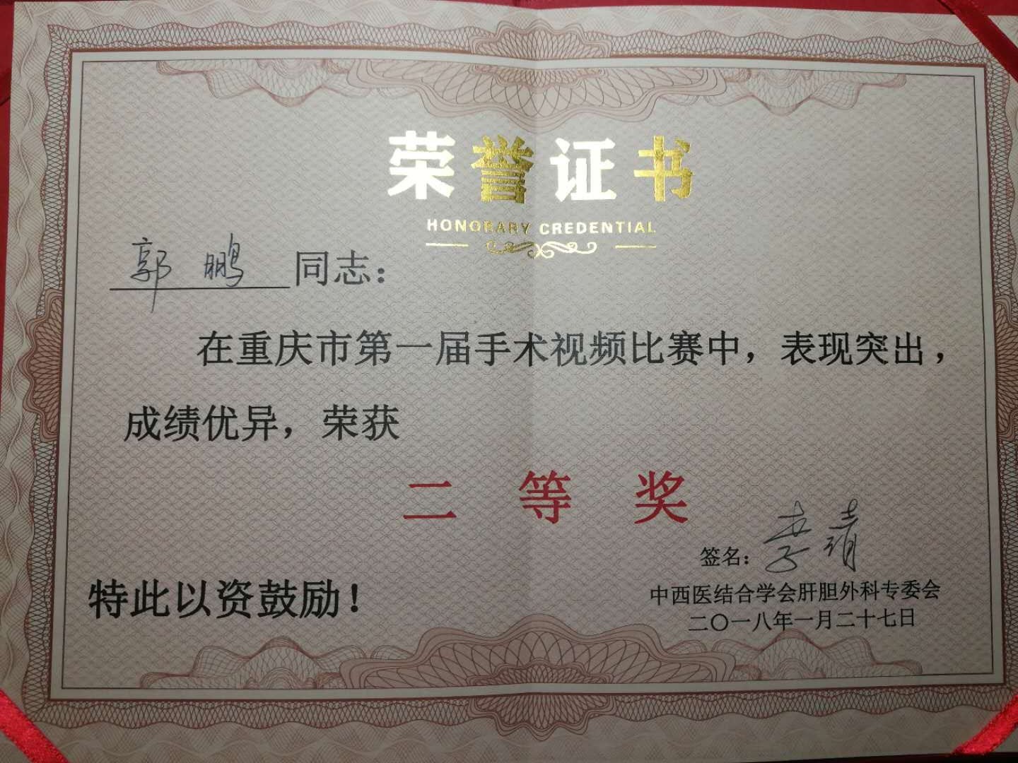 消化疾病中心郭鹏在中西医结合学会肝胆外科专委会举办的重庆市第一届手术视频比赛中荣获二等奖