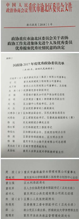 骨与创伤中心主任蒋电明教授被政协重庆市渝北区委员会评为2017年度优秀政协委员