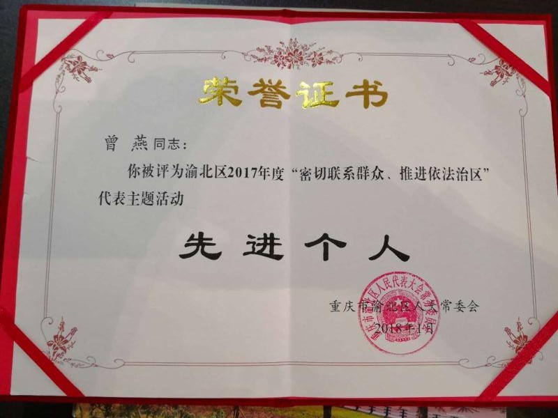 党委副书记、副院长曾燕同志被重庆市渝北区人大常委会评为“渝北区2017年度“密切联系群众 推进依法治区”代表主题活动先进个人”