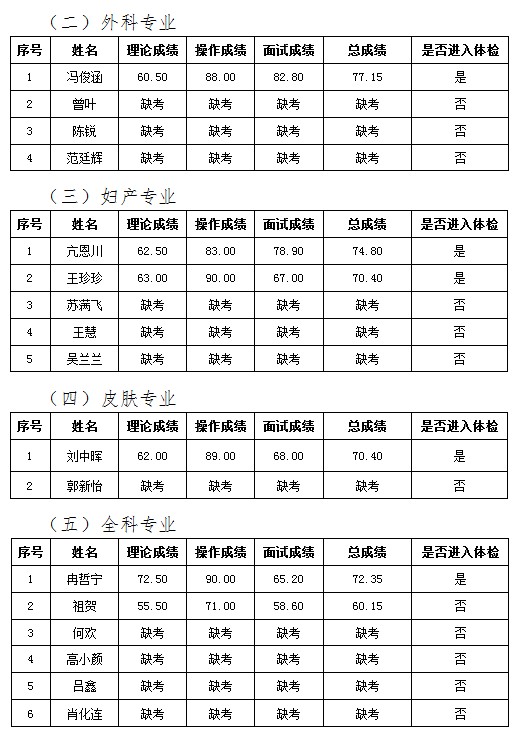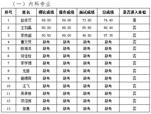 2024-06-07 11:20根据重庆市卫生健康委员会办公室《关于开展2024年重庆市住院医 师规范化培训招收工作的通知》要求,我院于2024年6月6日完成了2024 年住院医师规范化培训第二志愿招生考核工作,根据总成绩=理论成绩×30%+操作成绩×20%+面试成绩×50%,按单项不低于60分且总分≥70分的规则进行录取,现将考生总成绩及后续体检标准公布如下: