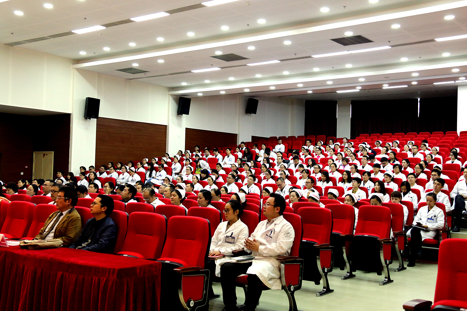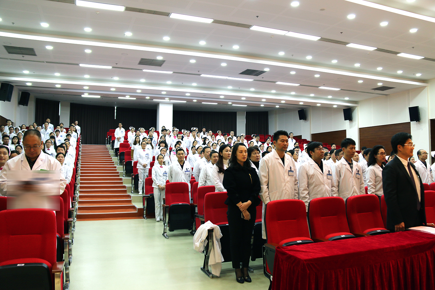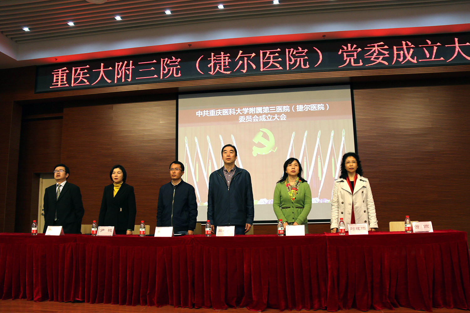 下午3时,按照议程,在主持人曾燕副书记郑重宣布大会开始后,全场起立奏唱《国歌》,嘹亮的国歌声在会场回荡。在介绍主席台成员后,校党委副书记冯跃林宣读了“中共重庆医科大学附属第三医院(捷尔医院)委员会成立”文件。