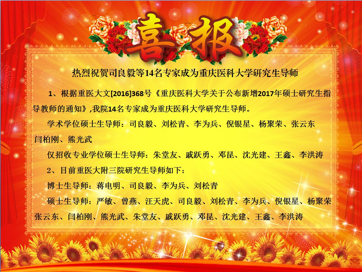 【喜报】热烈祝我院贺司良毅等14名专家成为重庆医科大学研究生导师