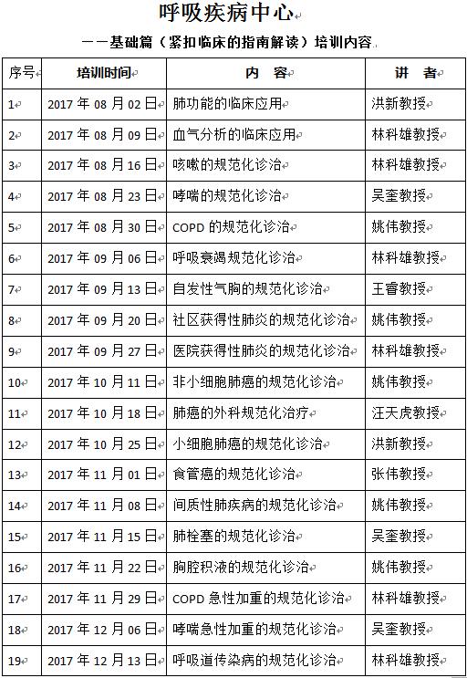 经中心洪新主任、汪天虎主任的统筹安排,决定从2017年8月开始进行呼吸系统疾病和食管疾病的规范化诊疗系列培训,每周三下午固定为科室业务学习和疑难病例讨论时间。并延续每周一中午为科室临床医疗科技新动态学习时间。