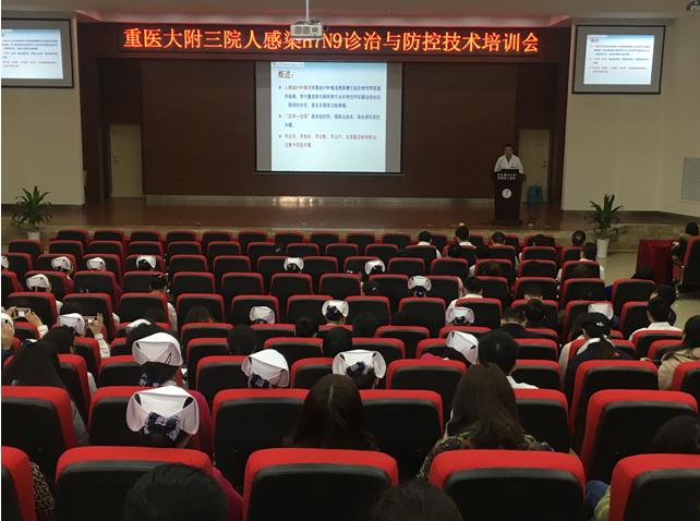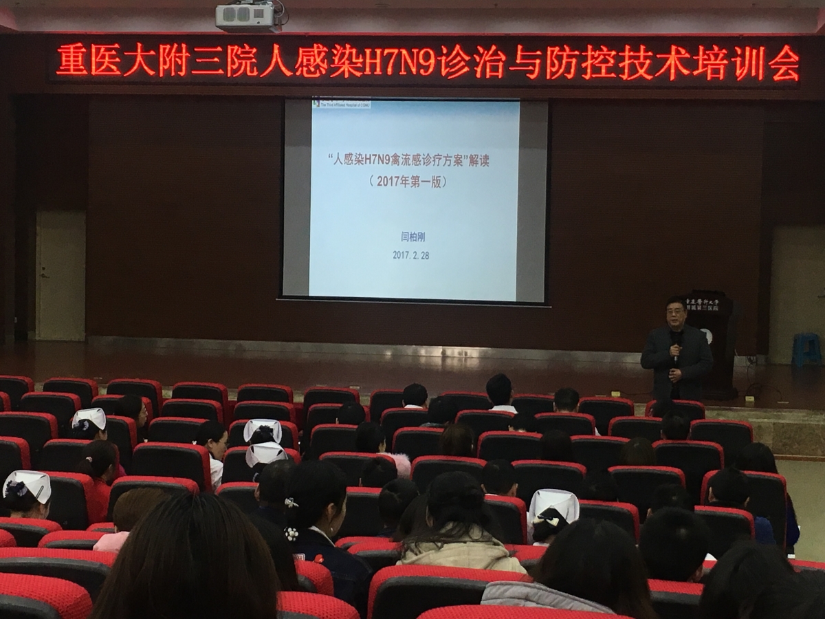 2017-03-01 00:00 近日,人感染H7N9禽流感已进入高发季节,为进一步提高人感染H7N9流感的防控水平和应对能力,2月28日下午,我院在学术报告厅举办了人感染H7N9诊治与防控技术培训会,朱耀明副院长、医务部钟高堂科长、后勤部钱凤英科长、各疾病中心主任、护士长、总住院医师以及呼吸疾病中心、消化疾病中心、门诊部、急救部、药剂科、放射科、检验科、除值班人员以外全院医护人员等205人出席会议。培训会由护理部盛孝敏主任主持,急救部闫柏刚主任和院感办廖文川分别就诊疗方案和防控方案的相关知识进行讲解。
