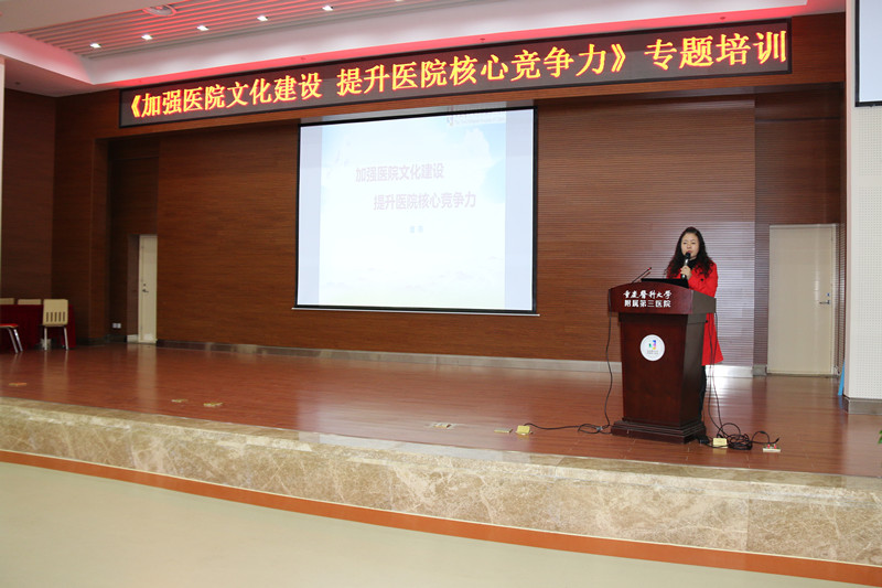为营造医院文化氛围,增强医院发展后劲,2017年3月2日,重医大附三院在学术报告厅举行了《加强医院文化建设 提升医院核心竞争力》专题培训,党委副书记、副院长曾燕主讲,院领导、全院中层干部及党员、职工等近200人参加培训。