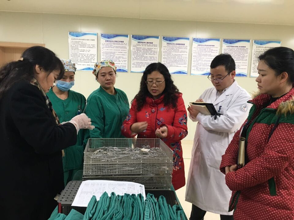 我科运行半年后,2017年1月10日,在副院长朱耀明和护理部主任盛孝敏的陪同下,重庆市卫计委、重庆市市疾控中心、消毒供应专业委员会三方联合到我院进行现场检查验收,对我院消毒供应中的科室管理、人员配置、工作流程、消毒质量、环节控制和设备管理等方面进行检查。