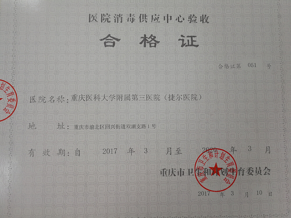 经重庆市卫计委的各项审核,长达3个月的漫长等待,于今年5月25日顺利取得《医院消毒供应中心验收合格证》,这意味着我院消毒供应中心各项检查项目均达到市级验收标准。
