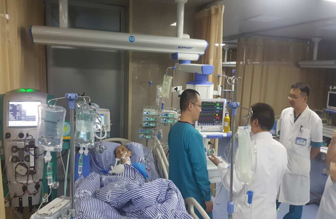 7月25日,急救部(中心ICU)收治了一位特殊患者,患者是一名89岁高龄的老年男性,基础情况极差、恶病质,入院时体重仅有30Kg,因多发性肺大疱曾辗转求医全市多家三甲医院,但都因高龄和基础情况太差而被拒之门外。患者家属慕名来到重医附三院,入住我院呼吸疾病中心。经该中心医护团队短短10余天的精心治疗,患者体重增长到了36Kg,精神状态也明显改善。两次全院多学科会诊后,7月25日由汪天虎副主任行单孔胸腔镜下右侧肺大疱切除减容术+胸膜固定术。术后因患者基础情况太差,随即就出现了脓毒性休克的各种表现,呼吸功能和肝功能急剧恶化、血压难以维持、乳酸进行性升高,命悬一线。家属一度对患者的病情完全丧失了信心。