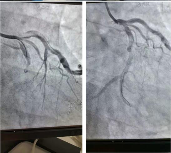 17:00,病人被送入导管室,消毒过程中,患者出现心率和血压下降,心率下降至35bpm,血压65/32mmHg,随后出现多次室速、室颤,情况异常凶险。在心血管疾病中心主任司良毅的主持抢救下,立即予以胸外心脏按压、除颤等治疗后,病人生命体征在药物维持下相对稳定,心率升至61bpm,血压98/50mmHg,17:15完成冠脉造影检查结果提示回旋支近段完全闭塞(左冠优势型,右冠脉先天发育细小),17:20行球囊扩张,回旋支血管可见TIMI2-3级血流,并于回旋支重度狭窄处置入支架,术后血流回旋支血流恢复至TIMI3级,患者胸痛、胸闷症状完全缓解。